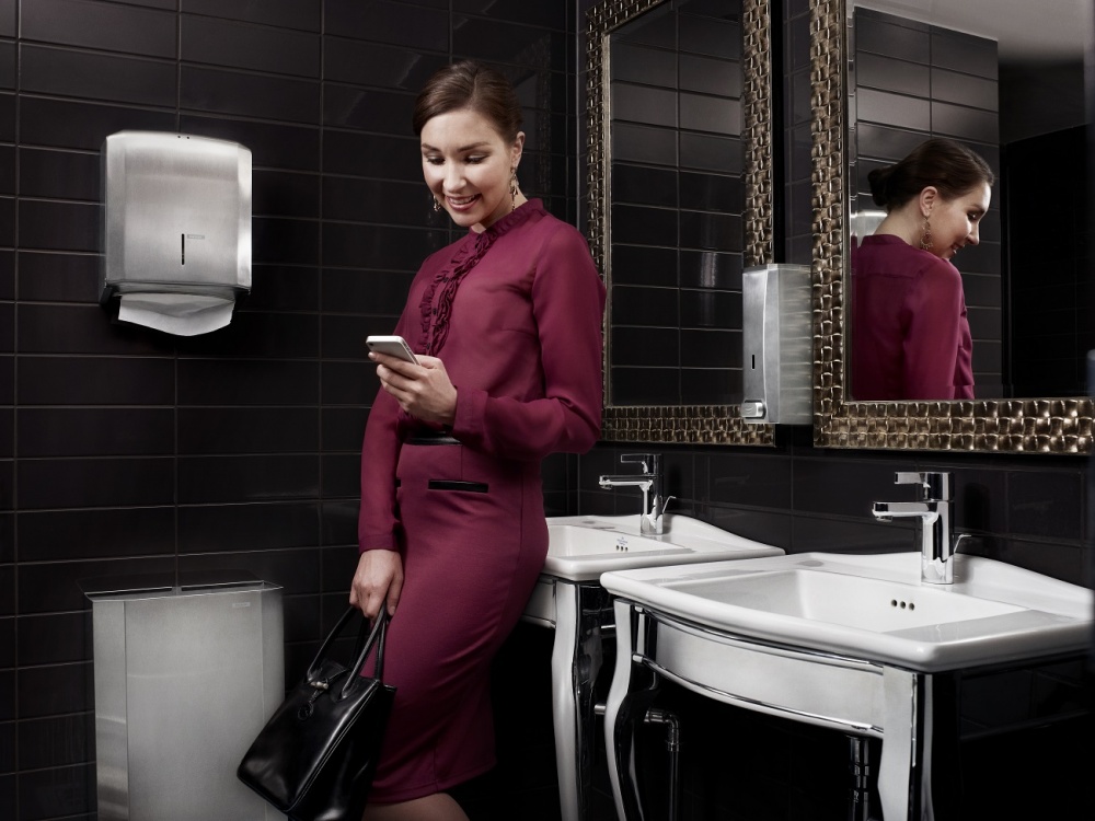 Plašs Katrin® nerūsējošā tērauda turētāju klāsts papīra dvieļiem, tualetes papīram, ziepēm, kā arī atkritumu tvertnes.
