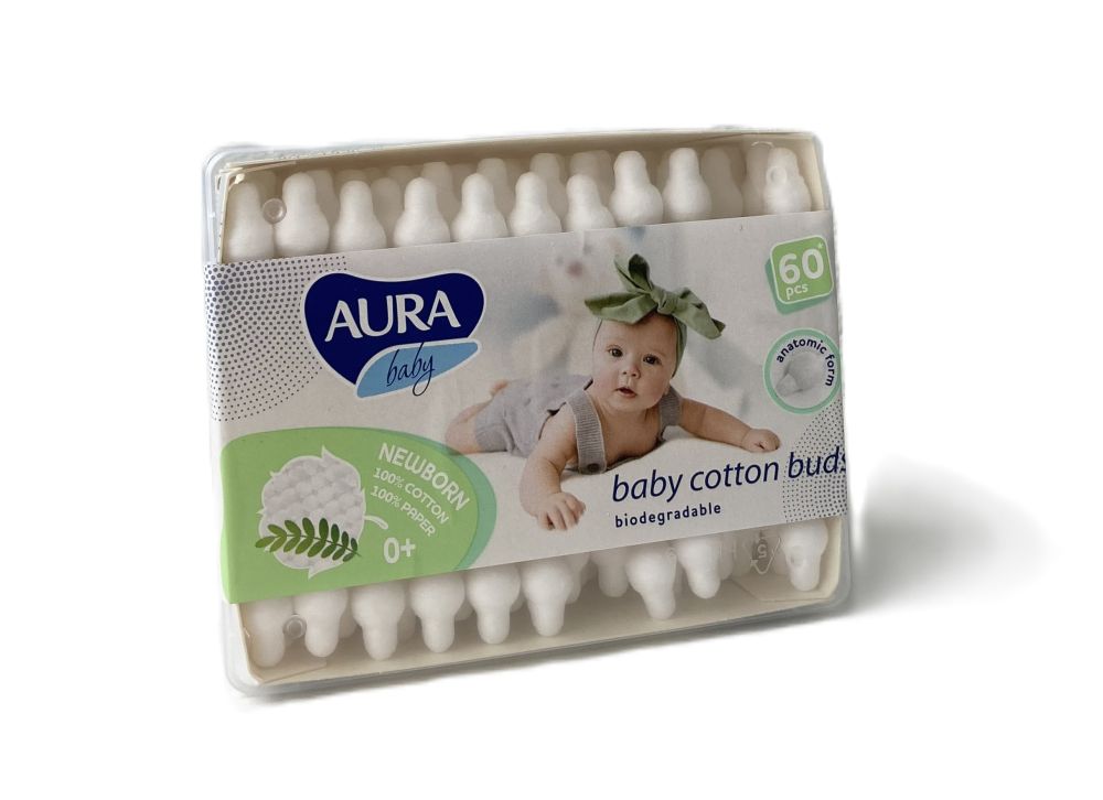 Vates kociņi Aura Baby. Sastāvs: 100% kokvilna, papīrs.