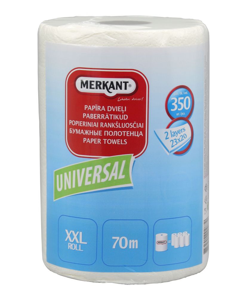 Papīra dvieļi ruļļos MERKANT, 2 slāņi, balti, 23x20cm, 350 loksnes, 70m, 1 rullis